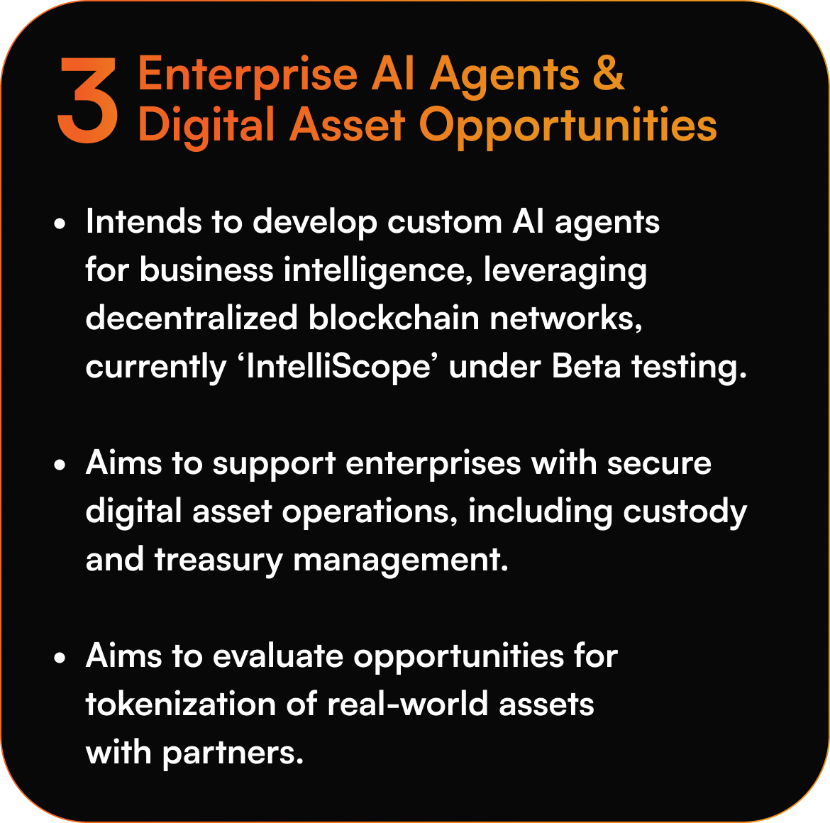 The statements above regarding the growth of the AI sector and investor interest in AI digital assets are projections only and there is no certainty that such growth will occur, or investor interest will continue. The Company intends to develop custom AI software for industrial clients, operate blockchain validator hardware that supports AI networks and investing in AI-related digital currencies; however, the Company’s operations will be subject to various market and regulatory risks and there is no certainty regarding the revenues or profits that the Company will generate from its operations. In addition the Company will need to market its products and secure customers prior to generation of revenues.